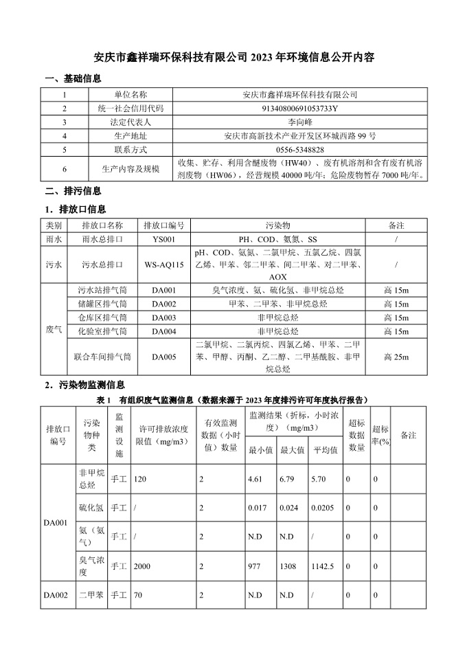 安慶市鑫祥瑞環(huán)保科技有限公司2023年環(huán)境信息公開內(nèi)容